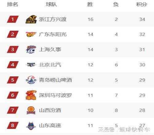 排在积分榜第7名则属于山西队,这一轮比赛,他们在客场输给了深圳队,球队目前的战绩为10胜8负。对于山西队而言,输掉这一战后,球队的压力还是比较大的。接下来他们还将面对广东队、北京队以及浙江队,想要全身而退,恐怕没有那么容易。而排在积分榜第8名则属于山东队,他们的战绩为11胜5负,由于少赛两轮的情况,山东队在排名上较为吃亏。